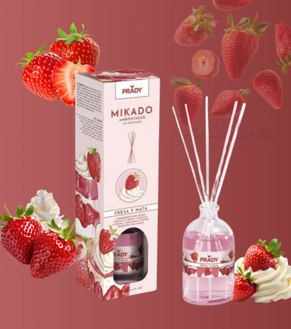 Mikado Prady de FRESA Y NATA con fragancia a Fresa refrescante y cremosa, con dulces acordes de pastelería, vainilla y caramelo ¡Para un ambiente dulce y acogedor!
