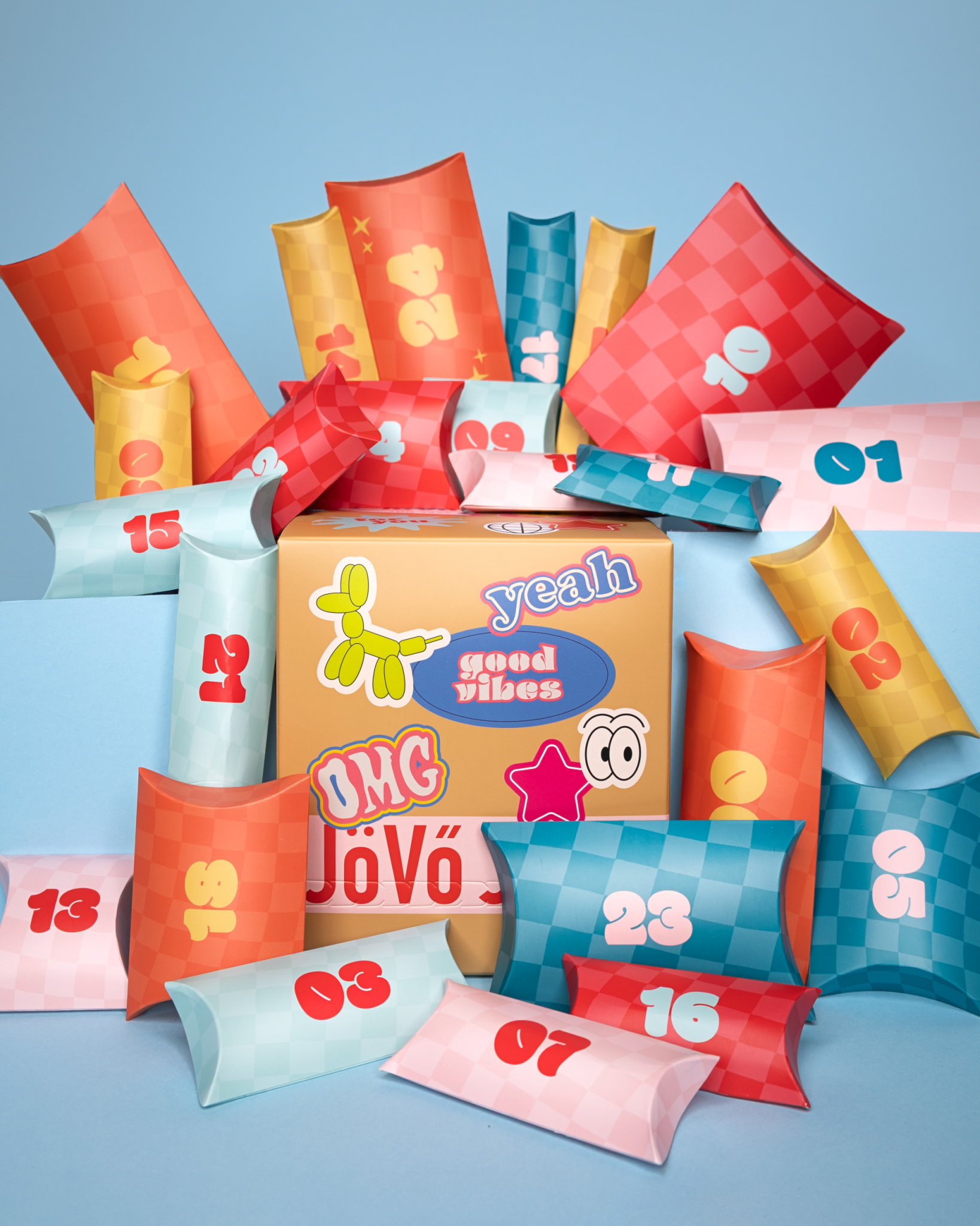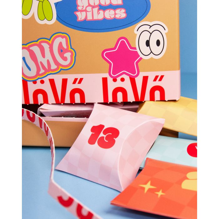 1. Parches antiacné / 2. Primer / 3. Corrector / 4. Alfombra para limpiar brochas / 5. Blush en crema / 6. Body mist / 7. Fijador de cejas / 8. Delineador líquido / 9. Sombra de ojos / 10. Lip pad / 11. Primer de labios / 12. Tatuaje de pecas / 13. Iluminador en crema / 14. Delineador de labios automático / 15. Sombra líquida / 16. Lipstick mate / 17. Lápiz de cejas / 18. Colorete / 19. Lip gloss / 20. Segundo delineador líquido / 21. Máscara de pestañas / 22. Lip plumper / 23. Paleta de sombras / 24. Cinta para el pelo