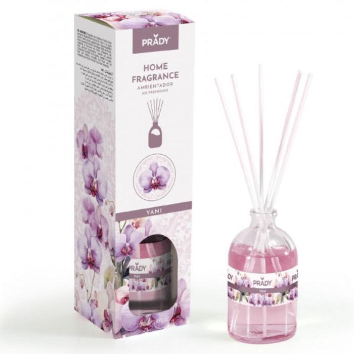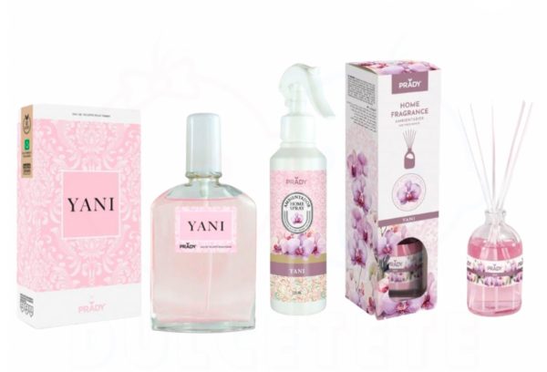 El set incluye un ambientador de varillas Fani, un ambientador en spray yani y un eau de toilette, cuidadosamente presentados.