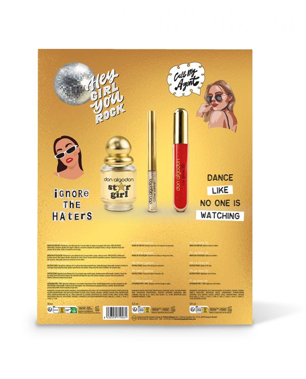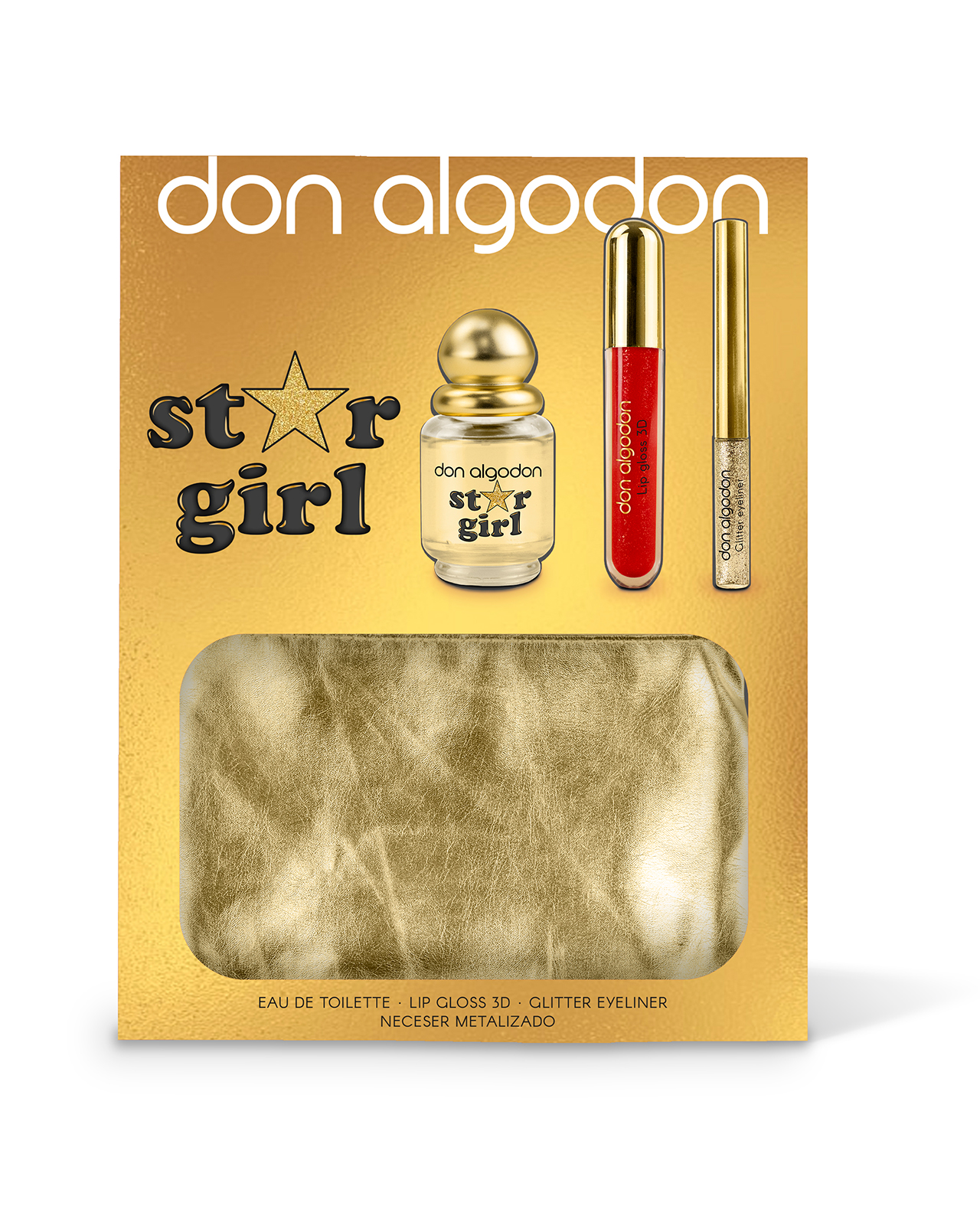 El Set de Regalo Star Girl de Don Algodón está diseñado para mujeres que desean brillar con su propia luz. El set se completa con un neceser metalizado, perfecto para guardar tus esenciales de belleza. Un regalo ideal para mujeres que buscan destacar y sentirse divinas.