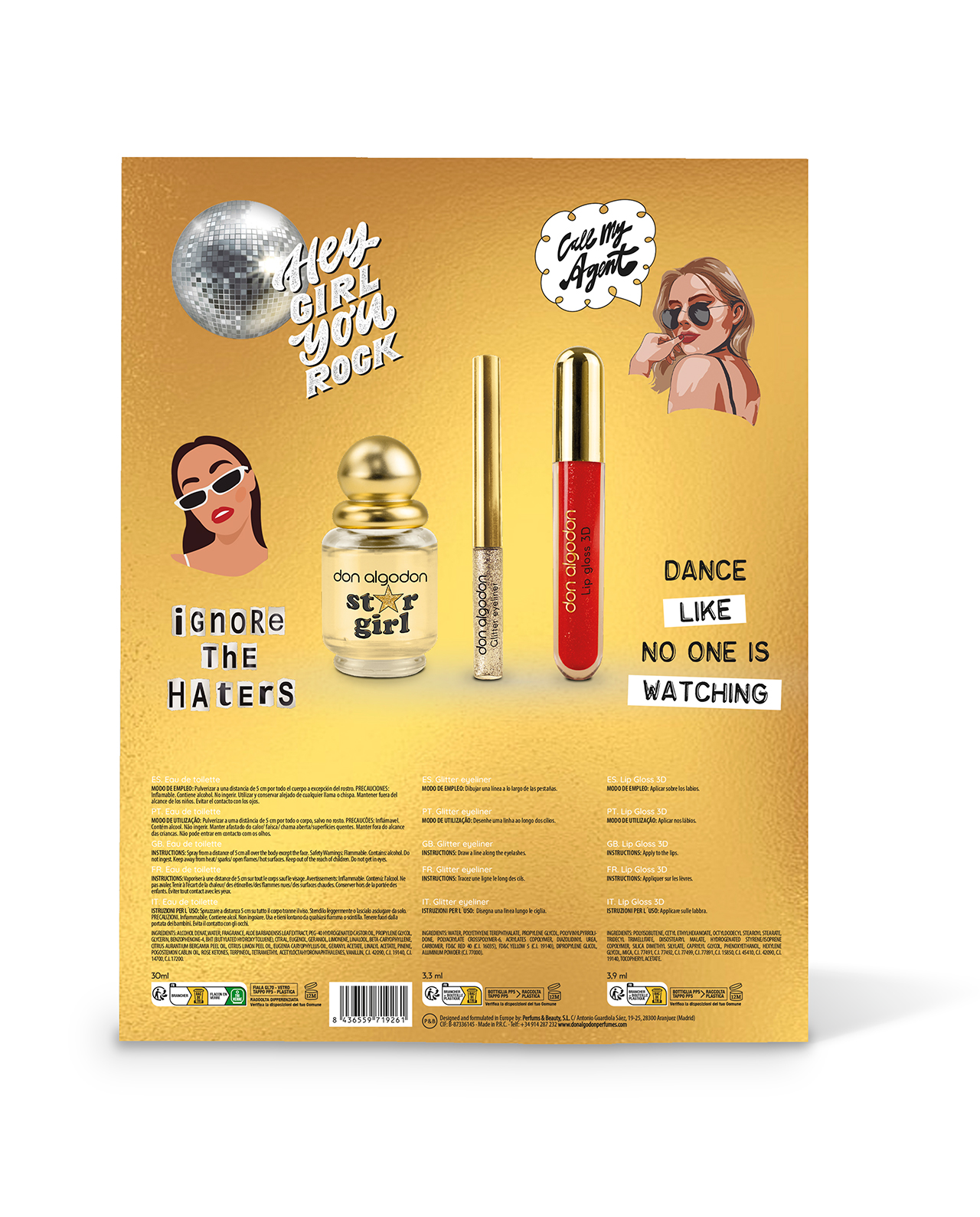 Este set incluye la Eau de Toilette Star Girl de 30 ml, una fragancia floral gourmand marina que mezcla notas frescas y dulces, ideal para mujeres únicas y deslumbrantes