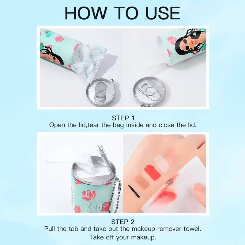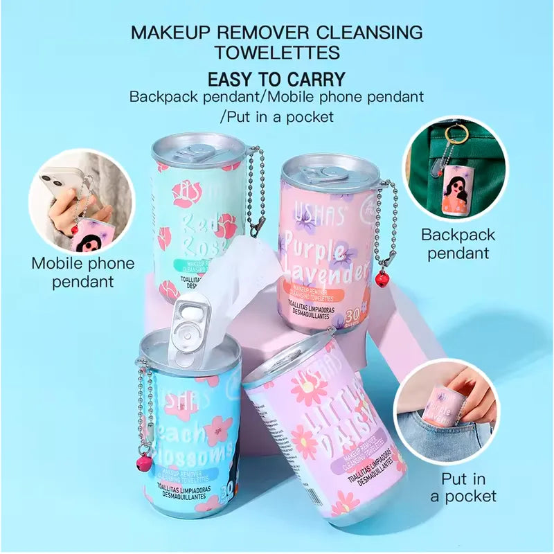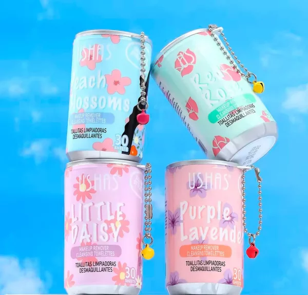 Estas divertidas latas contienen en su interior toallitas húmedas e higiénicas desmaquillantes y para manos, con aromas florales.